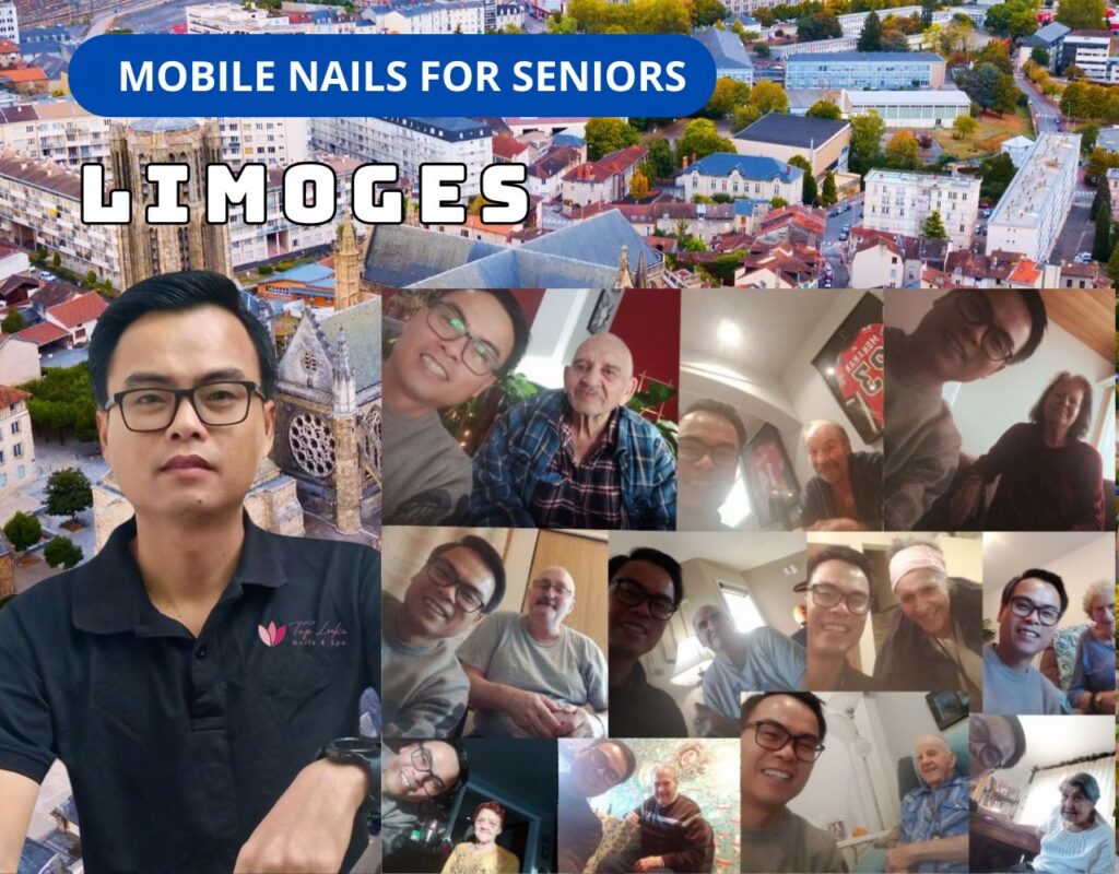 TapLook Nails & Spa offre des soins des ongles personnalisés aux patients, directement au chevet de leur patientèle, en proposant manucure, pédicure et soins spécialisés. Notre équipe se consacre à offrir des soins doux et relaxants dans cinq grands hôpitaux de Limoges, dont le CHU Dupuytren 1, CHU Dupuytren 2, Hôpital de la Mère et de l’Enfant, Hôpital Jean Rebeyrol, Centre de Gérontologie Chastaingt, Clinique Émailleurs-Colombier, Clinique François Chénieux, Polyclinique de Limoges, Centre Hospitalier Universitaire de Limoges (site principal), Serviced urgences / pédiatrie spécialisés du CHU Limoges. Notre objectif est de faire en sorte que chaque patient se sente pris en charge, à l’aise et rajeuni, améliorant ainsi son bien-être même pendant les périodes difficiles.